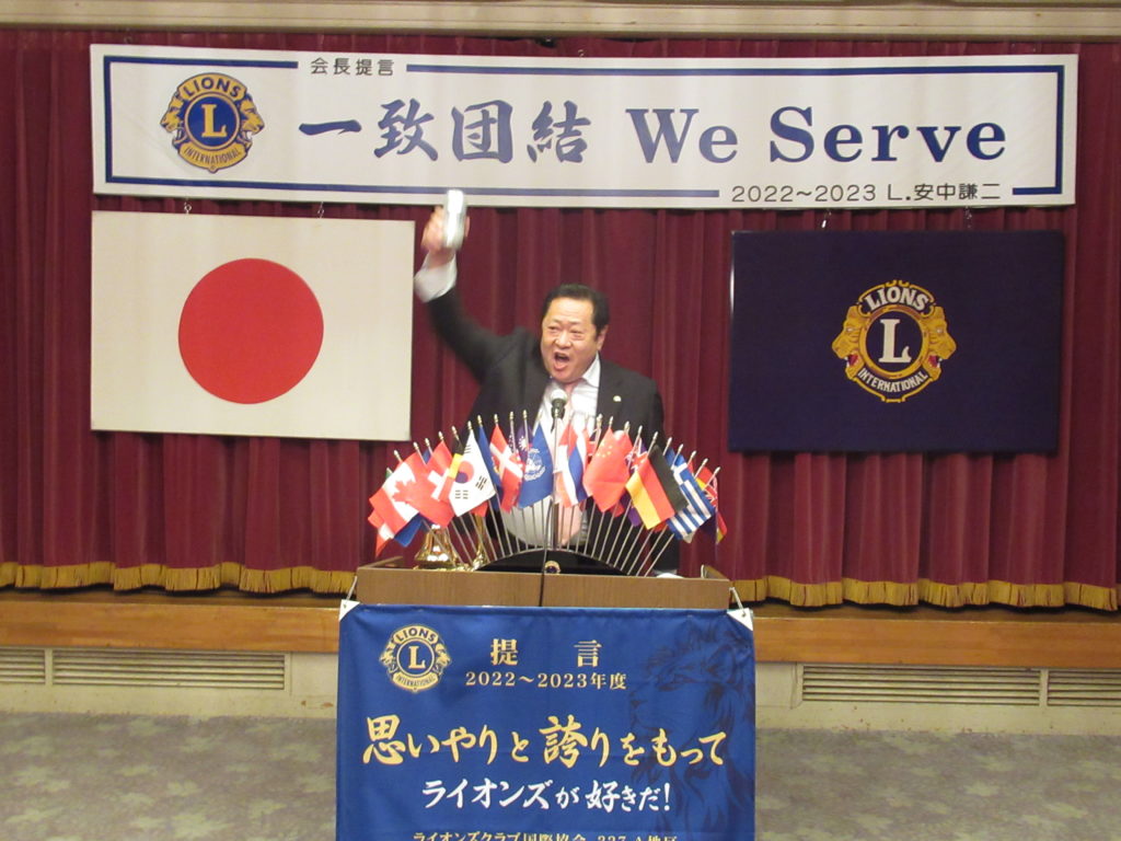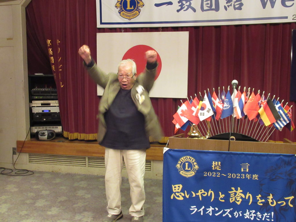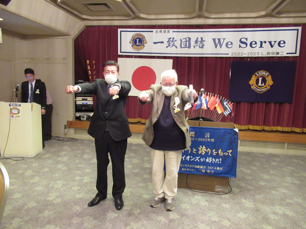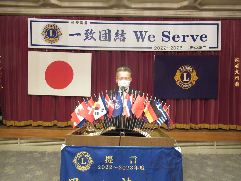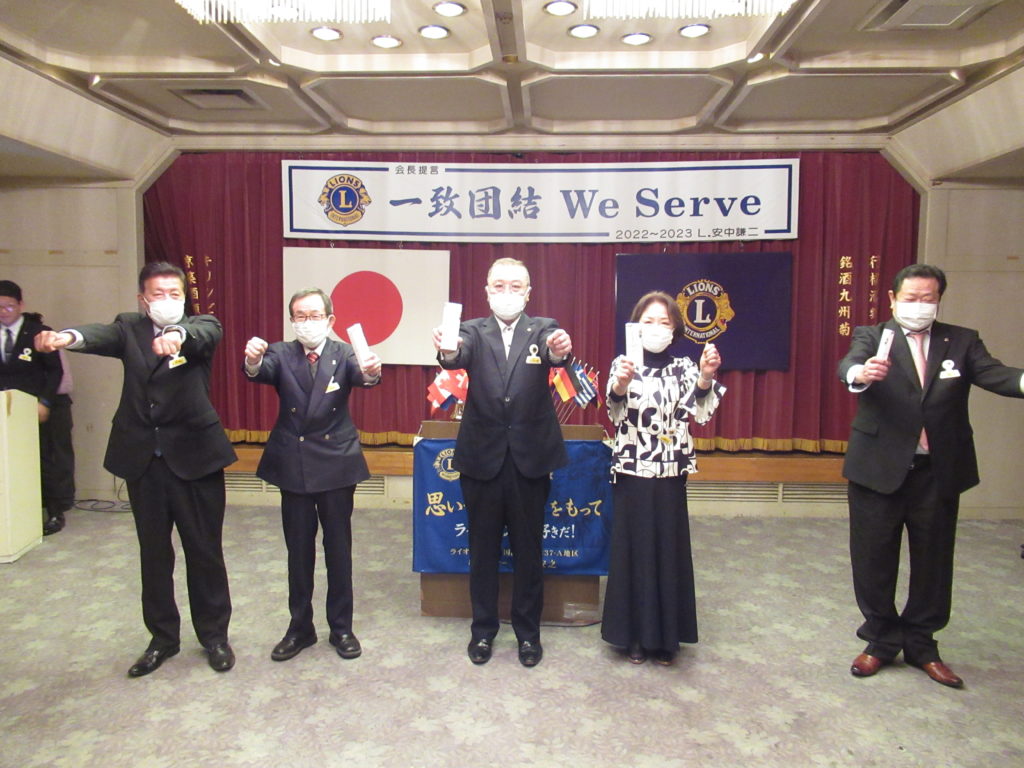 3月第一例会(第1521回)開催 by 事務局 / On 2023年3月6日 2023年3月1日(水)18:30~ みやこホテルにて 3月第一例会(1521回)を開催いたしました。 例会では「福岡子どもホスピス&ハウス」建設および運営へのご支援を要望する署名を皆さんにお願いしましたところ、沢山署名をいただきました。 また、マイルストーンシェブロンアワード(LCIF$1000献金4回目・5回目)が授与されました。 先月新入会員の皆さんをお迎えして、益々賑やかな活気のある例会でした。 ライオンズの誓い 3月生まれの皆さん おめでとうございます マイルストーンシェブロンアワード 乾 杯 ライオンズローア