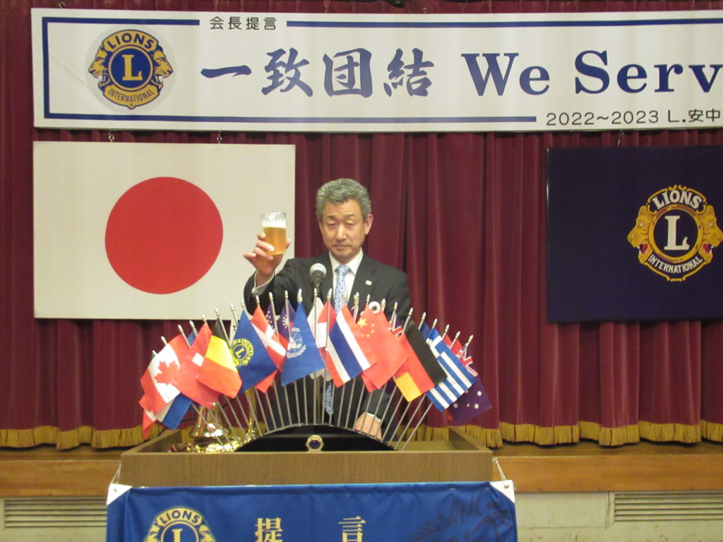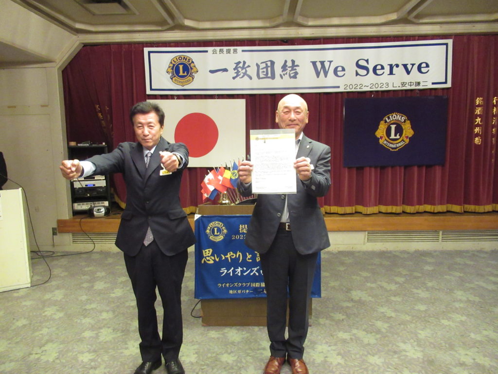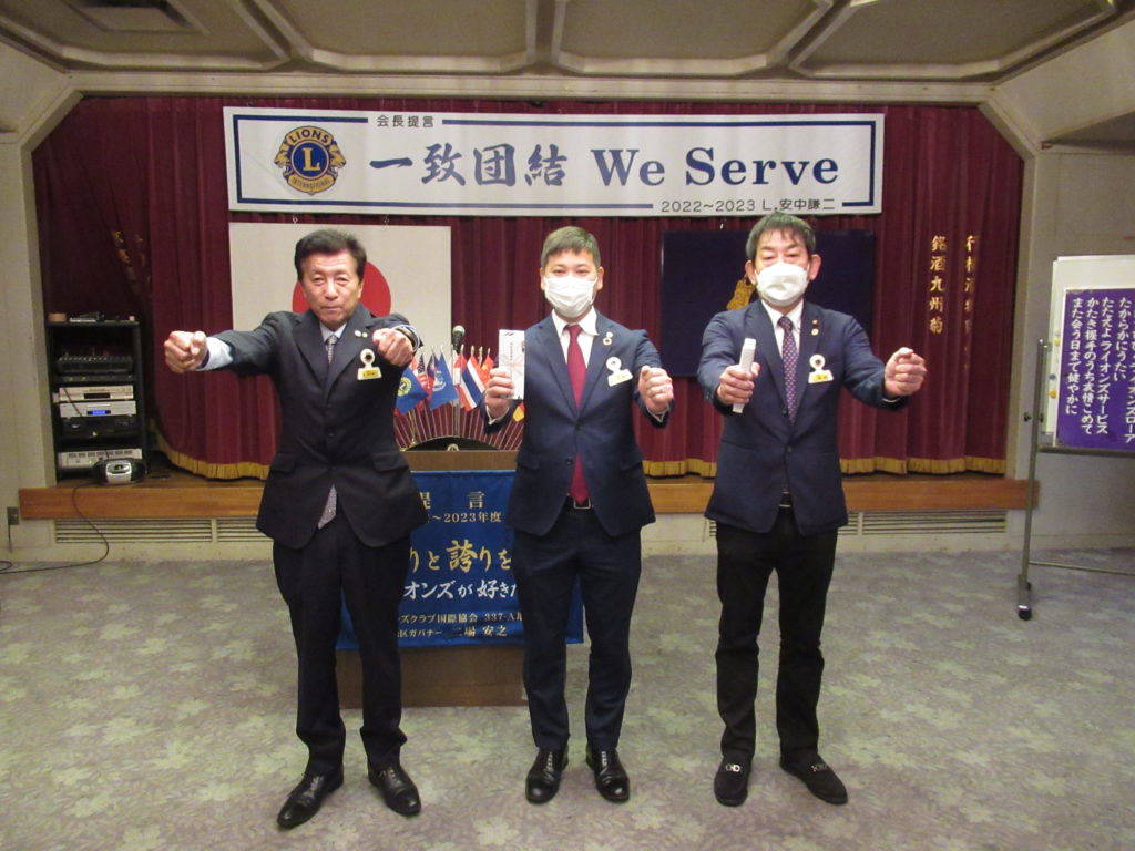 4月第二例会(1524回)開催 by 事務局 / On 2023年4月27日 2023年4月19日(水)18:30~ みやこホテルにて 4月第二例会(1524回)を開催いたしました。 4月第一例会は島原ライオンズクラブの「花見例会」に参加したため、行橋での例会は約1か月ぶりとなりました。 ライオンズの誓い 賞の伝達 <マイルストーン・シェブロン・アワード 20周年> 4月生まれの方 お誕生日おめでとうございます 乾 杯 ライオンズローア