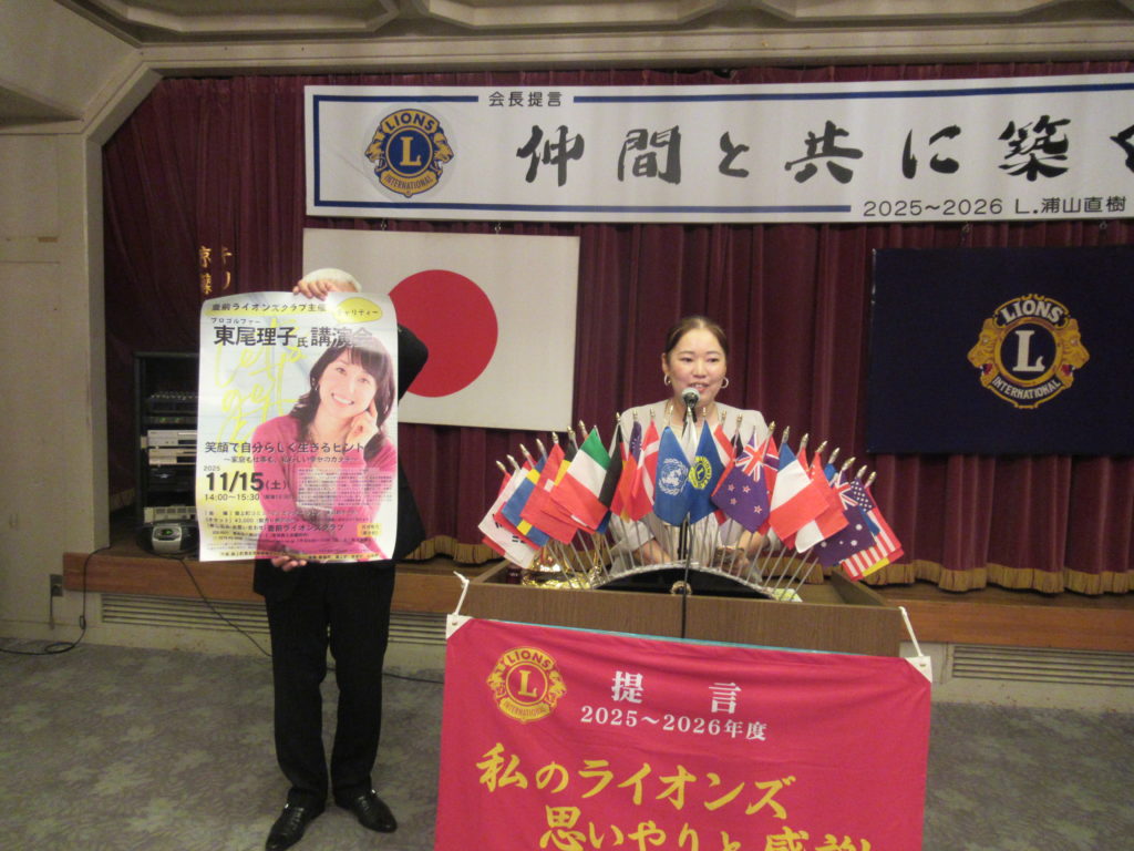 豊前ライオンズクラブ主催「プロゴルファー 東尾理子氏チャリティー講演会」キャラバン隊実行委員長より、チャリティー講演会のご案内がありました